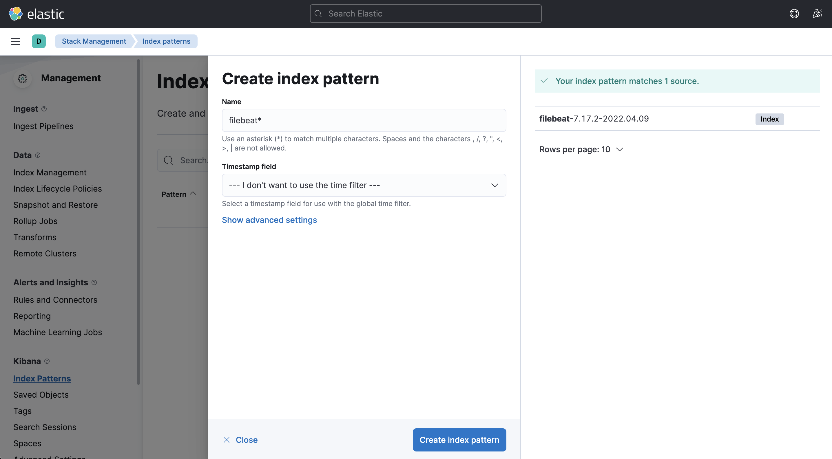 http://localhost:5601 에 접속하여 제대로 실행되었는지 확인하고, Index Patterns로 이동해서 index pattern을 설정하면 된다.