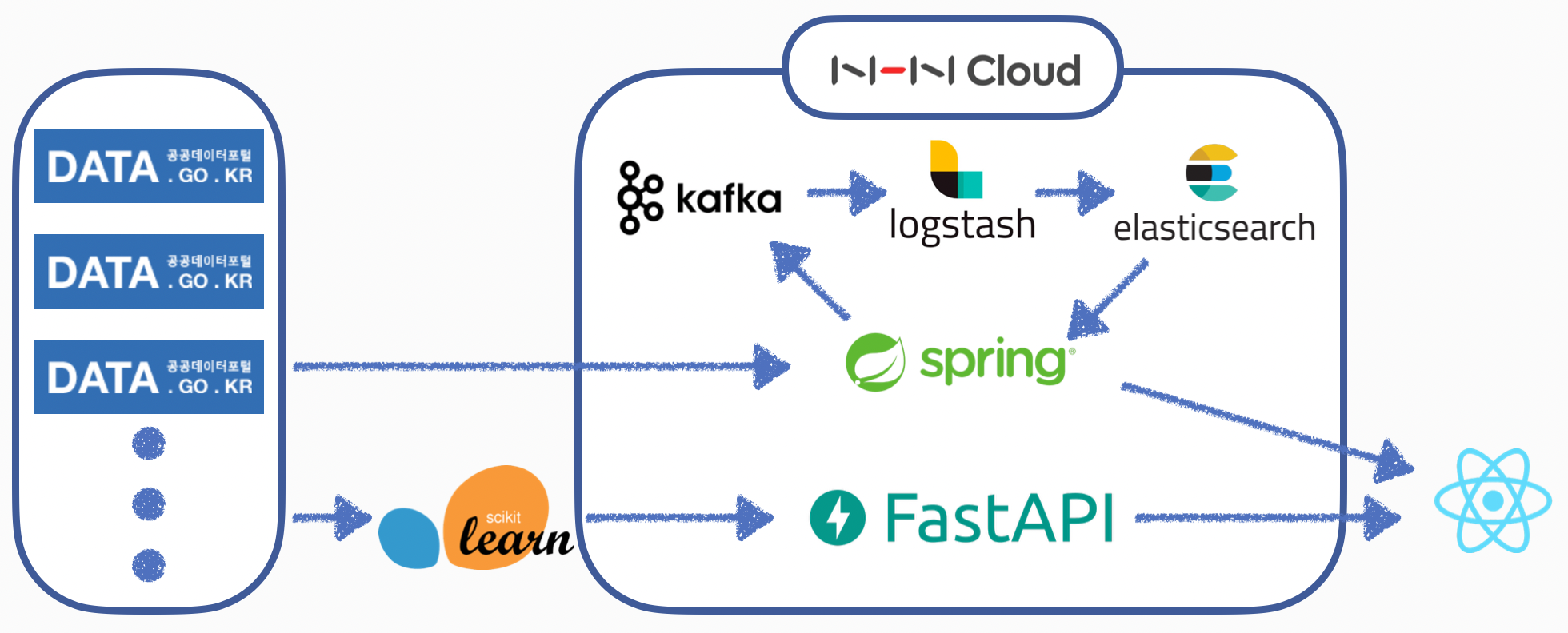 프로젝트는 국토 교통부에서 제공하는 공공데이터 API를 활용해 데이터를 수집하고, Elastic Stack을 사용해 데이터 처리/시각화하는 과정으로 진행했다. 또한 기상청에서 제공하는 공공데이터도 활용하여 하루 탄소 배출량 예측 모델을 만들고, 이를 FastAPI를 통해 서비스를 제공해주는 과정도 진행했다.