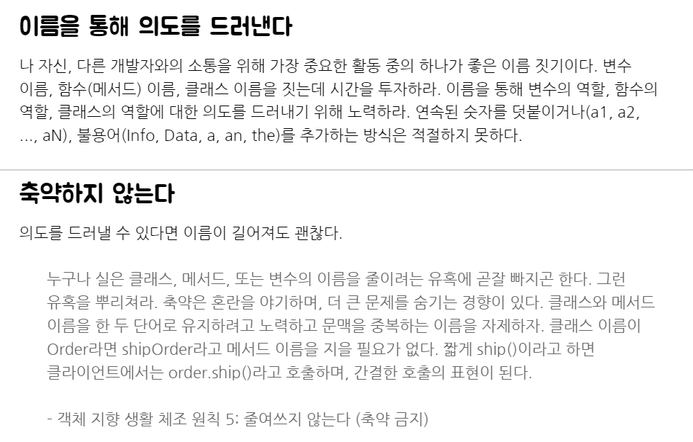 - 클래스, 메서드, 변수 명을 지을 때는 축약하지 않고, 최대한 그 역할을 드러내도록 짓기