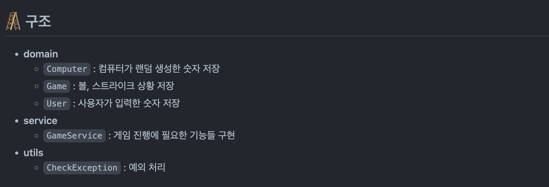 미션에서 요구하는 숫자야구 게임 자체가 복잡한 기능들이 필요한 게임이 아니기 때문에 간단하게 기능만 구현할까도 생각했지만, 오히려 간단한 기능들만 필요하다 보니 구조에 더 신경을 써야겠다고 생각했다.