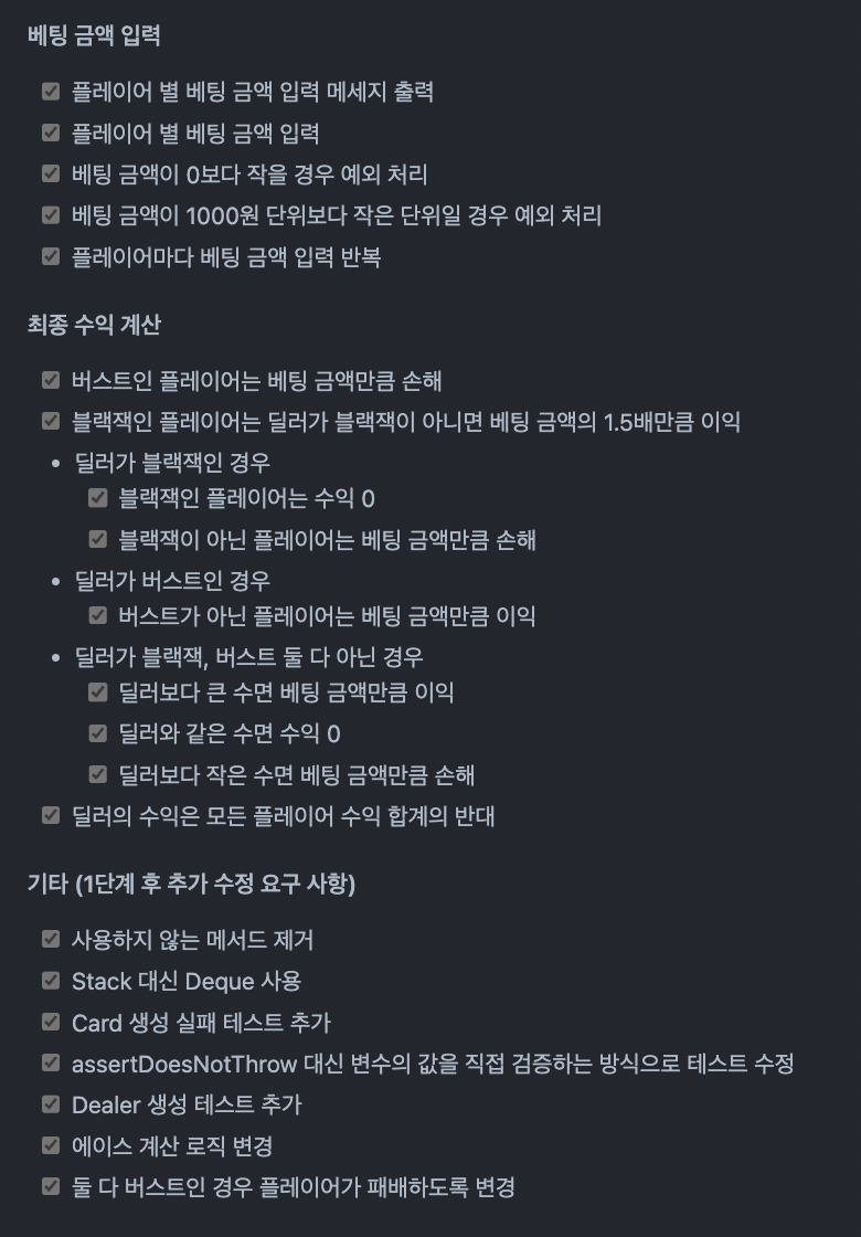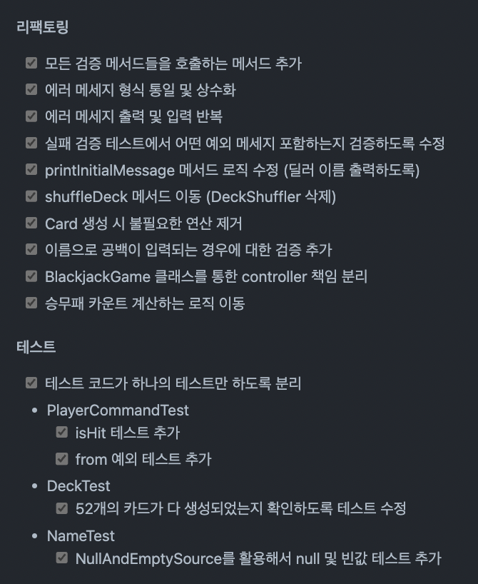 안녕하세요 카프카! 블랙잭 게임 - 1단계 미션 PR 제출합니다. 🙇♂️ 아직 부족하지만 잘 부탁드립니다 :) 감사합니다!