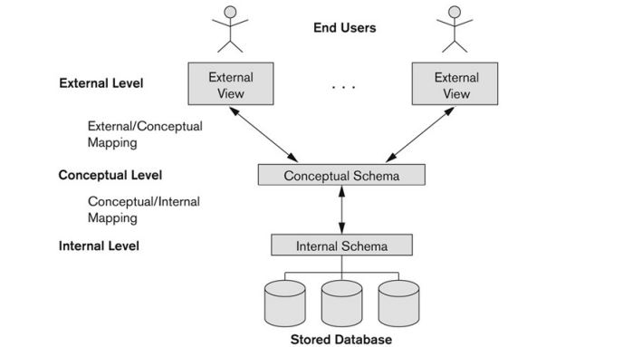 실제 데이터는 physical level에만 존재하기 때문에 external schema로부터 요청이 들어오면 conceptual schema를 거쳐 internal schema에서 실제 데이터에 접근해 요청을 수행한다.